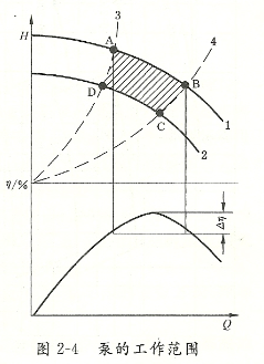 渣漿泵型譜圖上每個點對應一個工況,泵在最高效率點工作是最理想的,但這一要求并不現(xiàn)實,一般是規(guī)毫一個工作范圍,如圖2 4中的曲線1中的AB段,在此范圍內(nèi)泵運行的效率下降不大。通過改變轉(zhuǎn)速或切割葉輪也可擴大泵的運行機制范圍,曲線2即是改變轉(zhuǎn)速或切割葉輪前后的特性曲線,藍線3、4是政變轉(zhuǎn)17“速的相似拋物線或是切割外徑的切割線(拋物線)。方塊ABCD稱為泵擴大了的工作范圍,泵可以在此范圍的任一點工作,而且效率下降最多不會超過5%~8%。把許多泵的工作范圍畫在一張坐標圖中,稱為渣漿泵型譜。為了使圖形協(xié)調(diào),高揚程和大流量時的工作范圍不致過大(因高揚程大流量的工作范圍相對變大),通常采用對數(shù)坐標表示。一般每種系列渣漿泵有一個型譜。